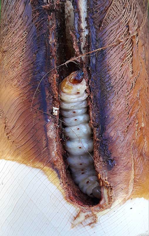 Cette larve de papillon du palmier, l’archon de Paysandisia, a été mise à nu dans sa galerie. Les parties blanches indiquent la présence d’un organisme vivant, tandis que les zones brunes témoignent de tissus déjà morts.