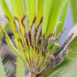 Entre les premiers et troisièmes stades, le palmier est encore dans la course et peut retrouver la santé si l’on intervient rapidement. Attention toutefois à ne pas confondre avec d’autres maladies du palmier. Chez Trachycarpus, l’attaque débute souvent par une couronne divisée, avec d’un côté les jeunes feuilles, de l’autre les plus anciennes qui pendent. Ce détail doit éveiller la vigilance.